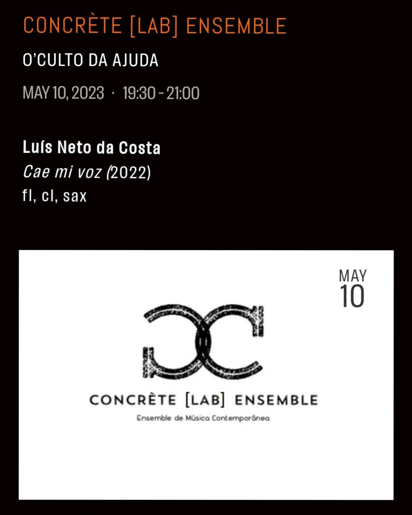 Next Wednesday, 10 May, my piece cae mi voz for flute, clarinet and baritone saxophone will be performed by the Concrète Lab Ensemble, under the artistic direction of João Quinteiro, at the Música Viva Festival in O’culto da Ajuda.