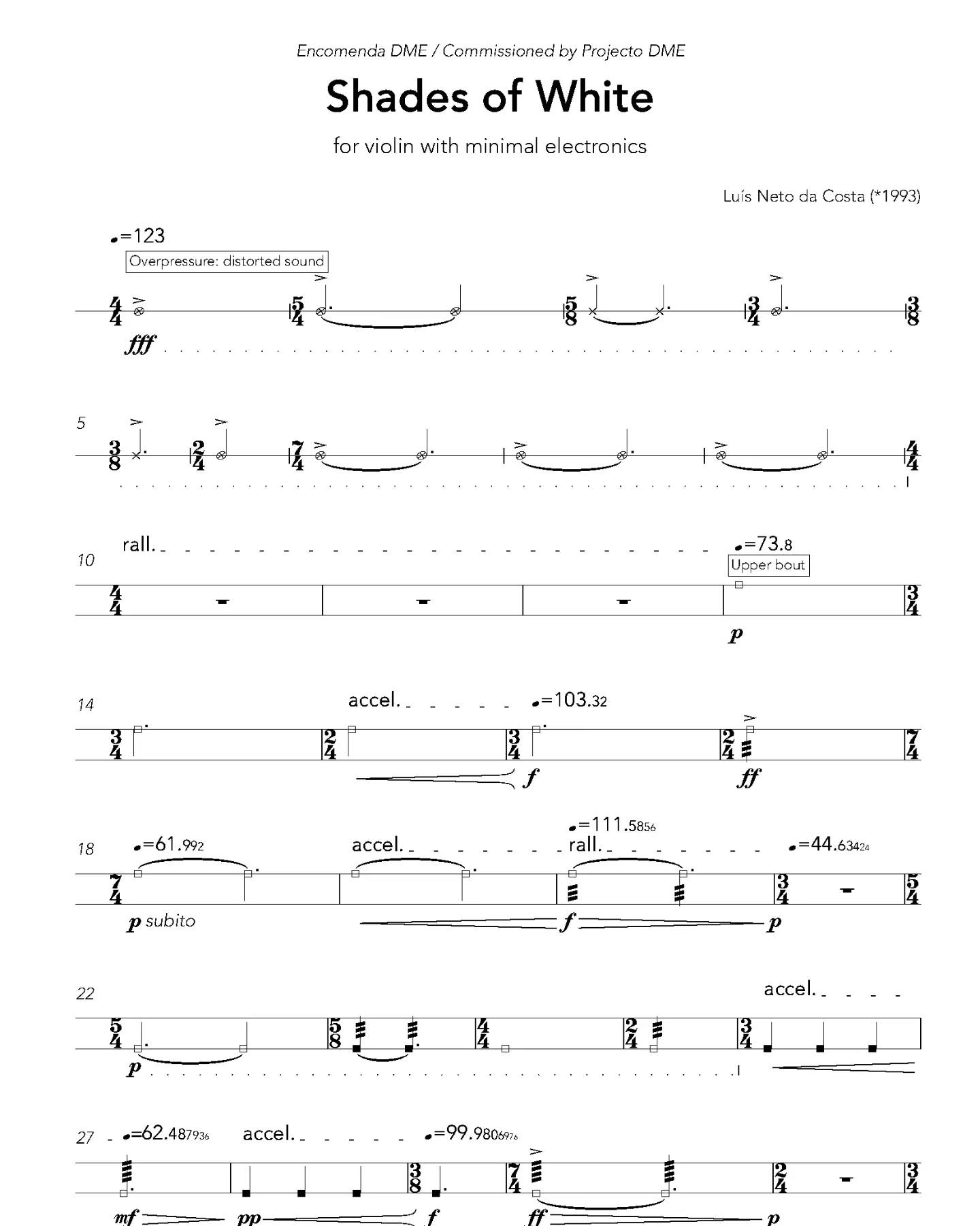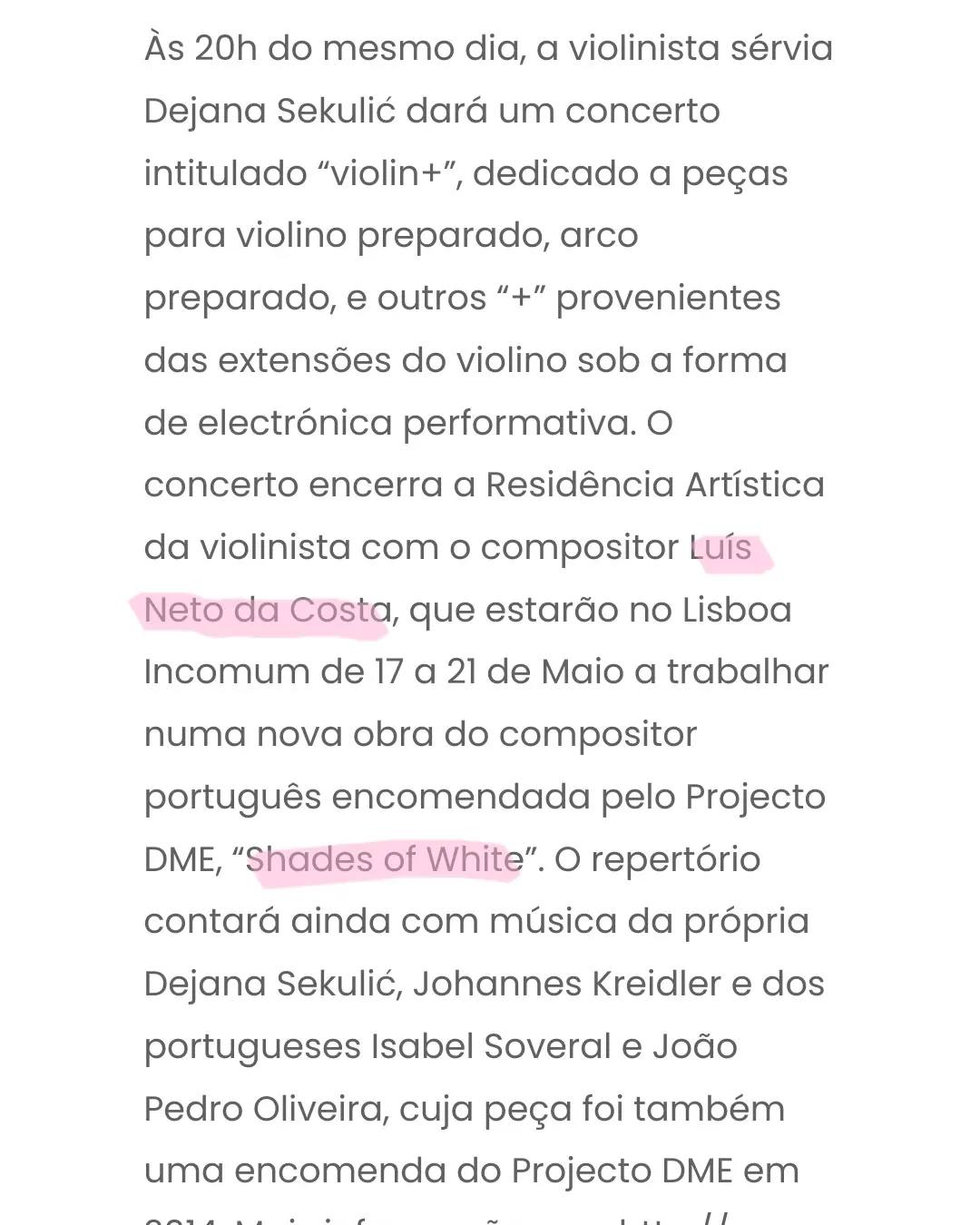 Next Saturday at 8pm, at Lisboa Incomum, my piece Shades of White for violin and minimal electronics will be premiered by the Serbian violinist Dejana Sekulić. The piece was commissioned by Projecto DME for the artistic residency during these days. The score has some peculiarities, such as the absence of pitches and the use of decimal tempo markings. Most of the time the violinist bows the body of the violin.