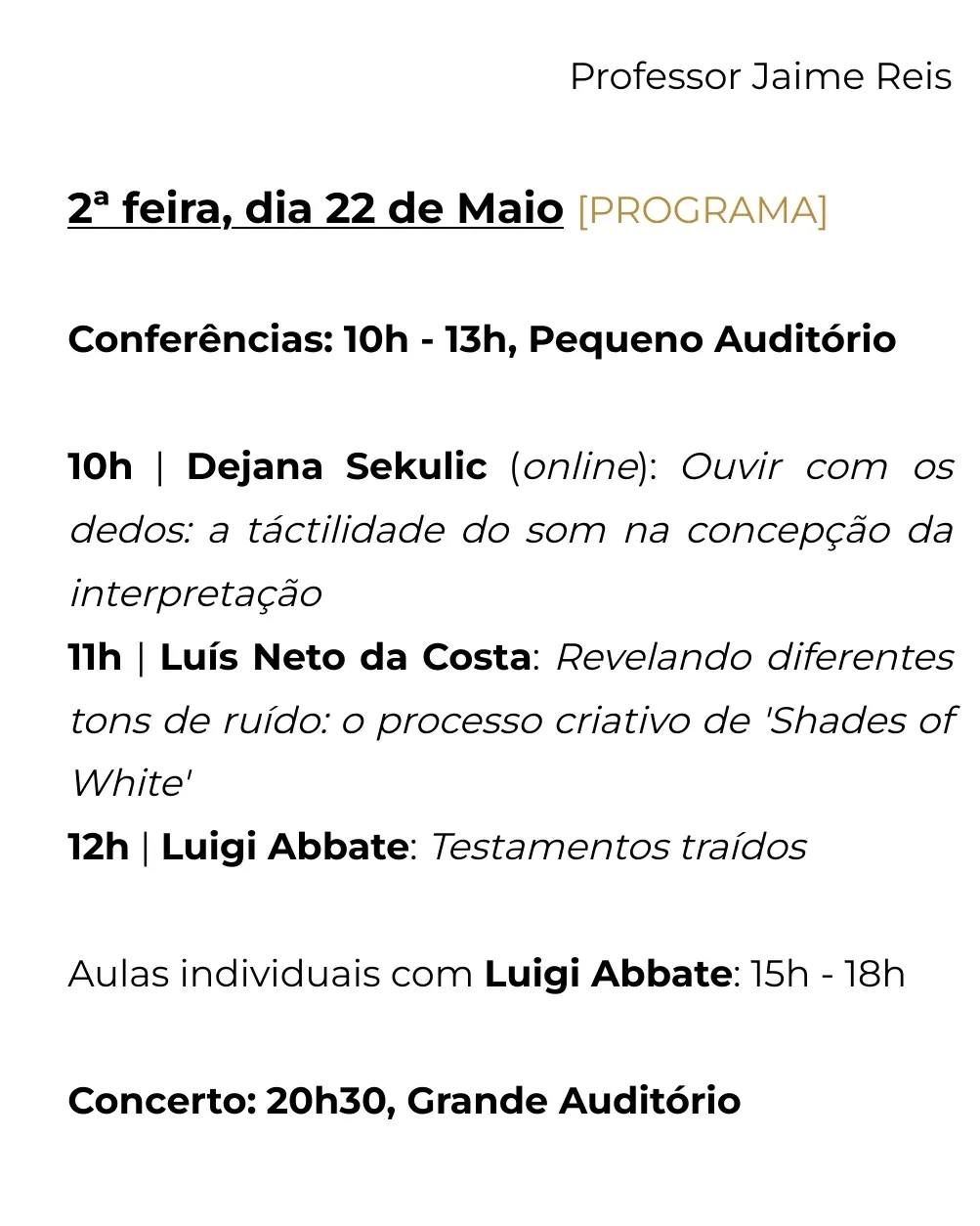 Tomorrow I’ll be giving a talk at the Composition Week 2023 of the Escola Superior de Música de Lisboa (ESML). The topic is about my piece that was premiered yesterday by Dejana Sekulić: “Revealing different tones of noise: the creative process of Shades of White”. Thanks to Jaime Reis for the invitation and congratulations to everyone involved in this interesting event.