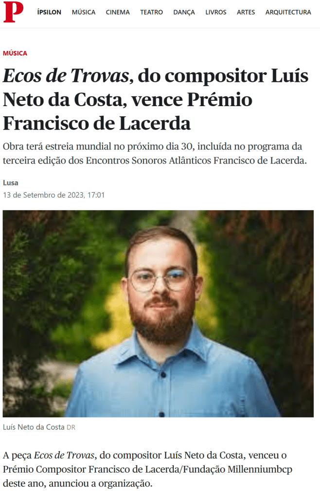 🇵🇹 Ecos de Trovas, do compositor LuÃs Neto da Costa, vence Prémio Francisco de Lacerda | Música | PÚBLICO (publico.pt)