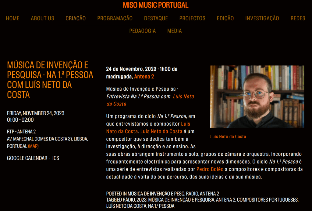 🇵🇹 Próximo dia 24 à 1:00 da madrugada (noite de 23), será transmitida na Antena 2 a entrevista que me foi feita pelo Pedro Boléo. Um convite do MIC.PT . Centro de Investigação & Informação da Música Portuguesa e da Miso Music Portugal para falar um pouco do meu percurso.