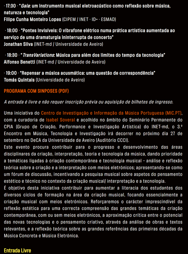Tomorrow I will be in the 3rd Meeting on Music, Technology and Research at University of Aveiro presenting “Rhythm and Harmonic Series in Painting on a Wooden Canvas of Resonances: An Analysis”.