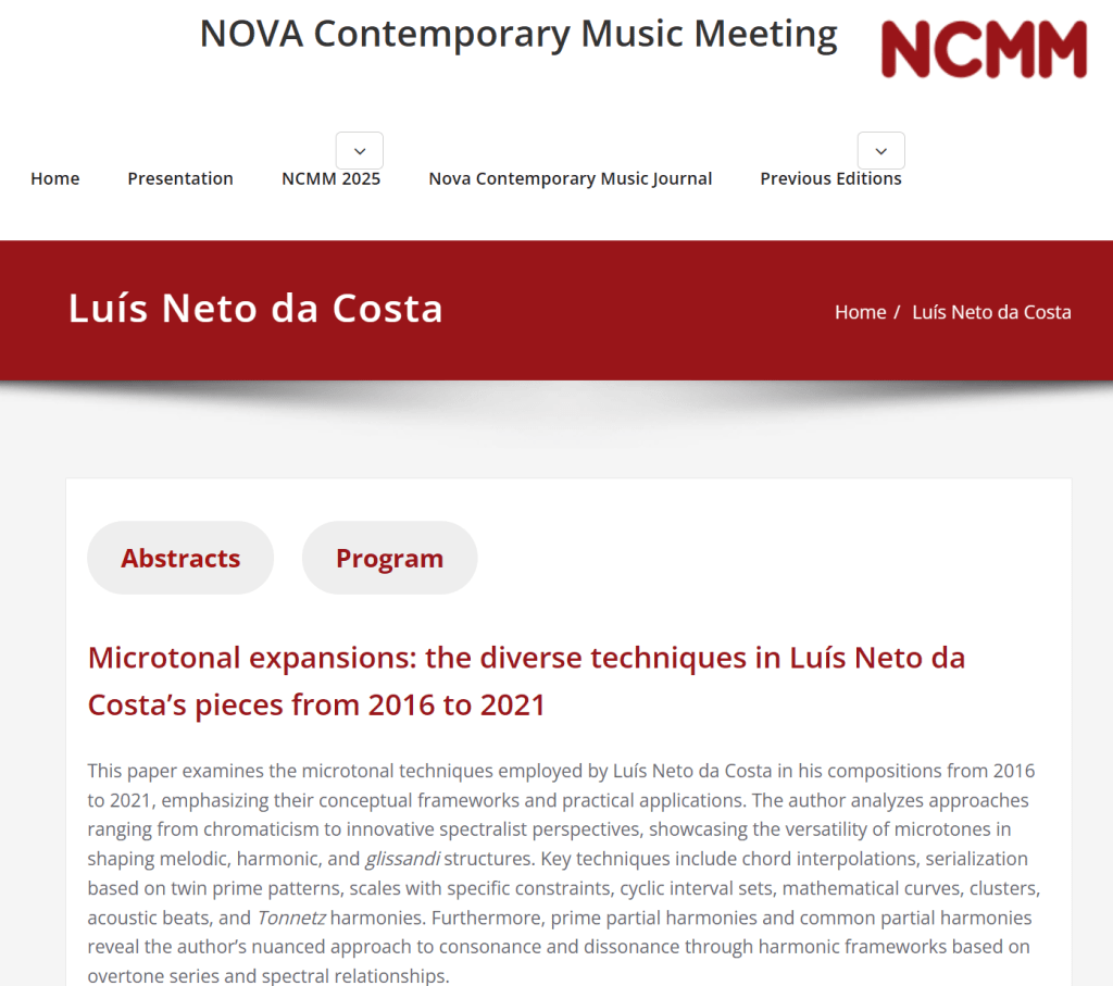 Next Thursday, I’ll be presenting a paper at the NOVA Contemporary Music Meeting – Lisbon, reflecting on the compositional techniques I explored between 2016 and 2021.