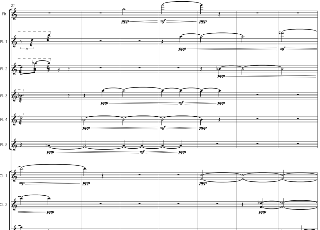Orchestra of flutes (6), clarinets (5), saxophones (4), percussion (3), and fixed media