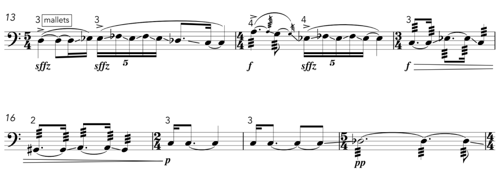The piece includes various techniques for timpani, like using a superball and fingers, but the main challenge is the different glissandi throughout the piece.