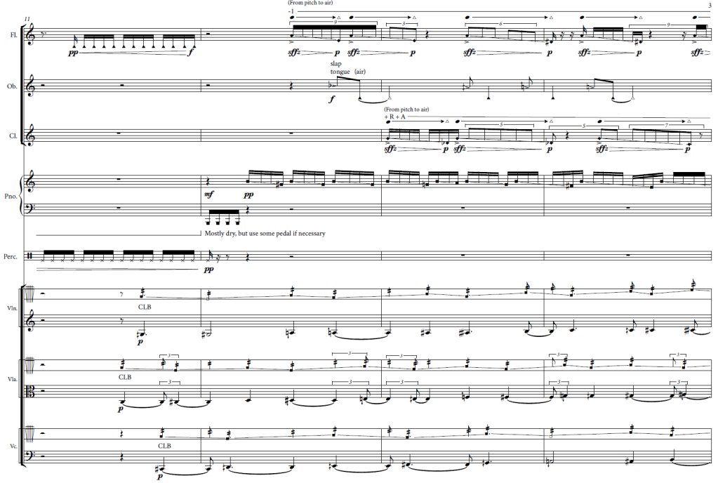 Flute, oboe, clarinet, piano, percussion, violin, viola, cello and electronics (optional)