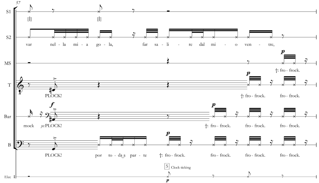 The piece features various polyphonic textures, extended techniques, and a noticeable use of sound painting.